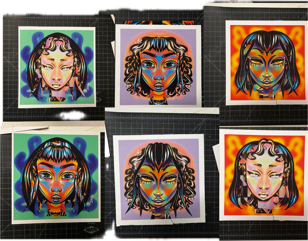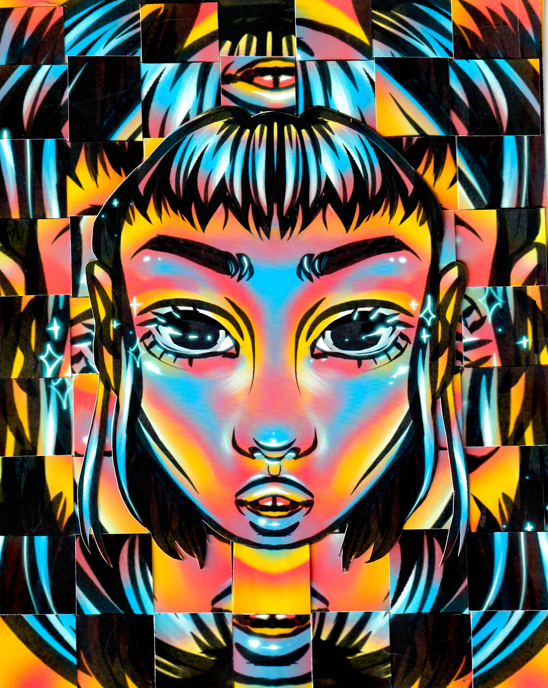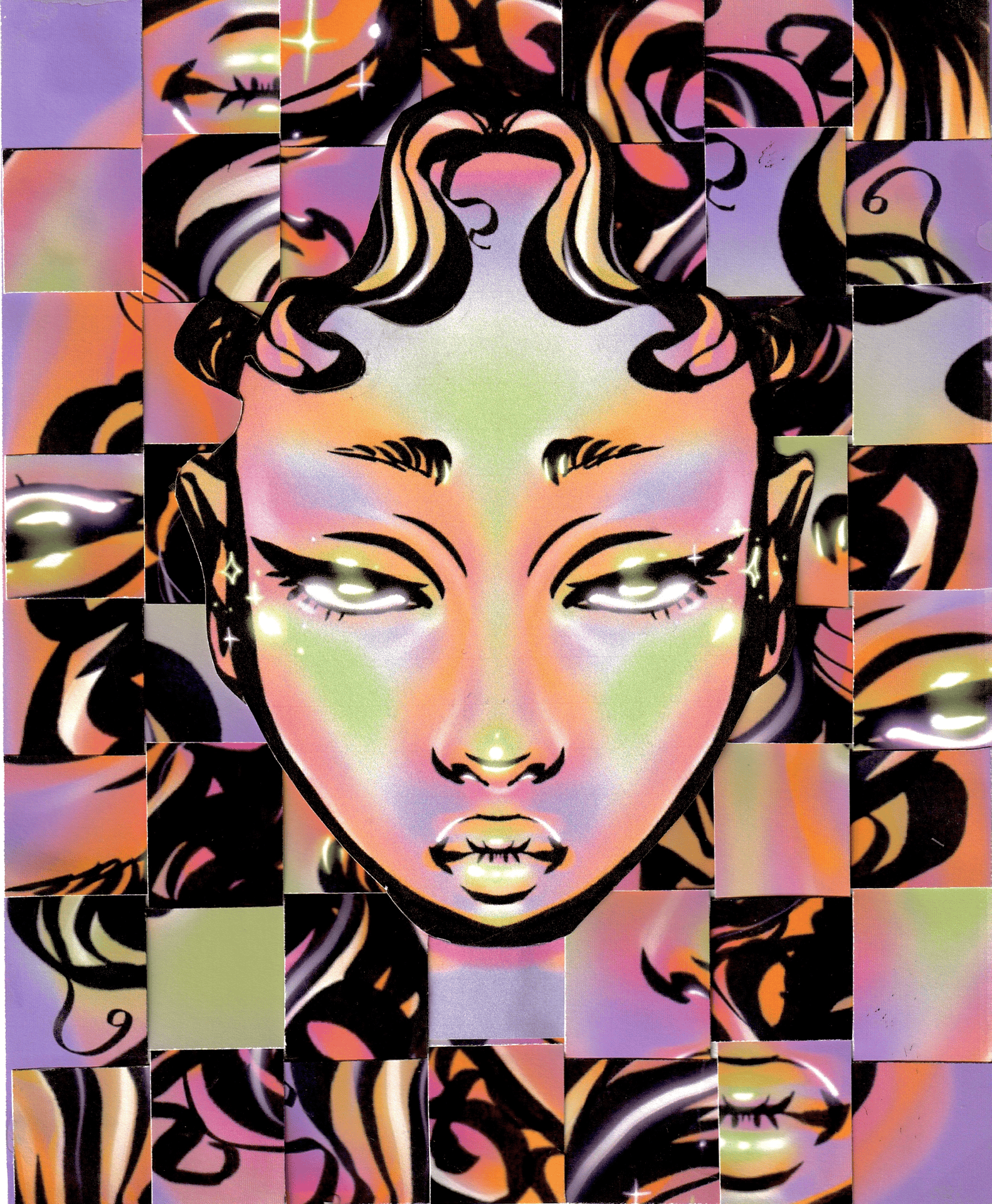 Collage exploration utilizing high resolution scans of my printed digital illustrations that I cut into strips and wove back together in various fashions to create new iterations of the girls. I gained new perspective through exploring iPad Pro & Apple Pencil, Procreate, Canon Pixma MegaTank Printer/Scanner, Canon Matte Photo Paper, X-Acto Knife